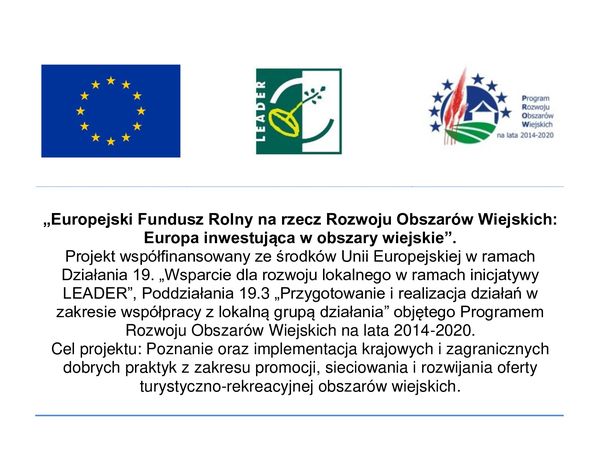 Dobiega końca nasz ostatni projekt współpracy pn. „Dobre praktyki w zakresie turystyki” realizowany w partnerstwie z LGD „Ziemia Zamojska”, LGD „Poleska Dolina Bugu” i LGD „Dolina Giełczwi”, współfinansowany ze środków Programu Rozwoju Obszarów Wiejskich na lata 2014 – 2020, poddziałanie 19.3 „Przygotowanie i realizacja działań w zakresie współpracy z lokalną grupą działania”. Celem projektu było poznanie oraz implementacja krajowych i zagranicznych dobrych praktyk z zakresu promocji, sieciowania i rozwijania oferty turystyczno-rekreacyjnej obszarów wiejskich.