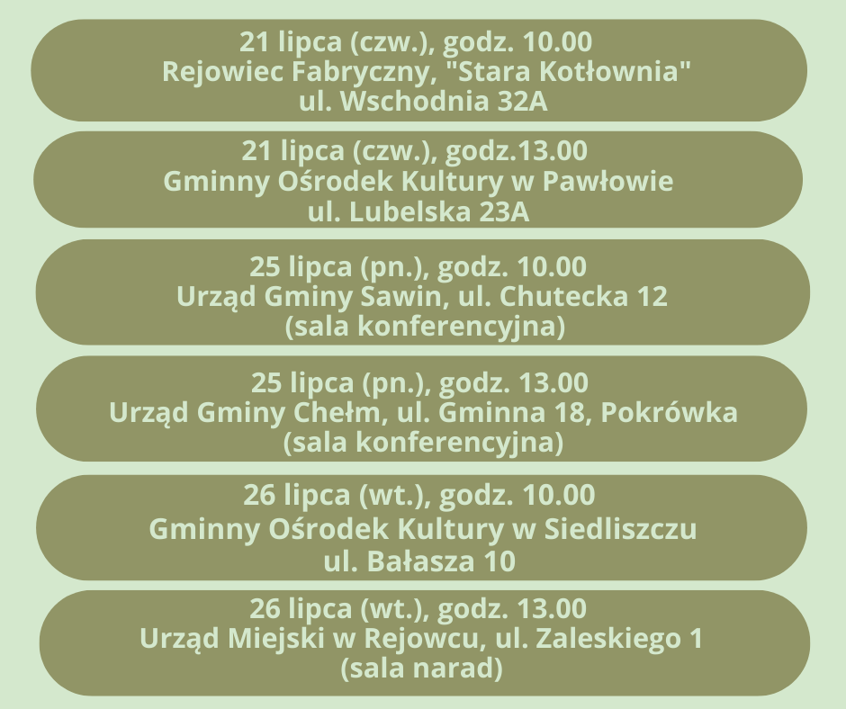 Poniżej przedstawiamy harmonogram spotkań konsultacyjnych w poszczególnych gminach członkowskich.